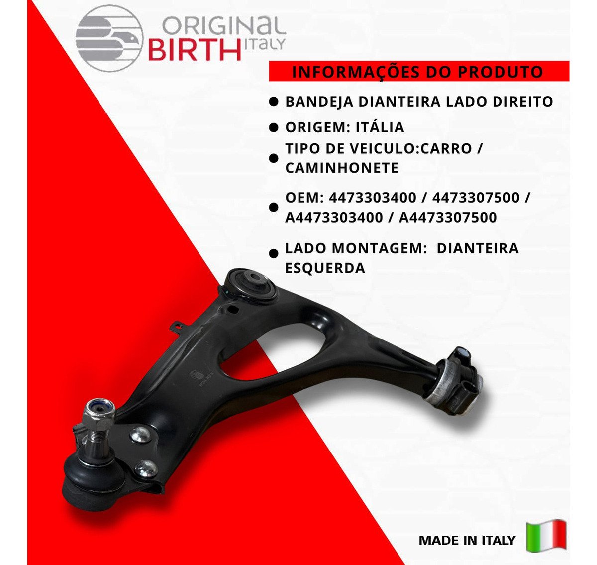 Descrição BANDEJA DIANTEIRA LADO ESQUERDO OBS BANDEJA DIANTEIRA LADO ESQUERDO COM PIVO MERCEDES VITO MODELO FURGAO Marca Birth Origem Italia Detalhes do produto ORIGINAL BIRTH são peças de altíssima qualidade fabricada na Itália desde 1979, a ORIGINAL BIRTH é um líder de referência para o mercado com uma qualidade ampla de componentes para todos os modelos de automóveis em circulação. Nível extremo de confiabilidade, são 7,5 milhões de artigos vendidos todos os anos e com presença mundial em 65 países, nos 5 continentes! Somos distribuidor oficial do Brasil da Marca ORIGINAL BIRTH, Todas as peças são novas na caixa e com garantia. Escolha ORIGINAL BIRTH a qualidade vai te surpreender! Informações Complementares Tipo de braço de controle: Braço de controle Rosca externa: 2 M 16 x 1,5 mm Posição de montagem: Eixo dianteiro, esquerdo Cilindrada: 16 mm Material: Aço laminado OEM 4473303400 / 4473307500 / A4473303400 / A4473307500