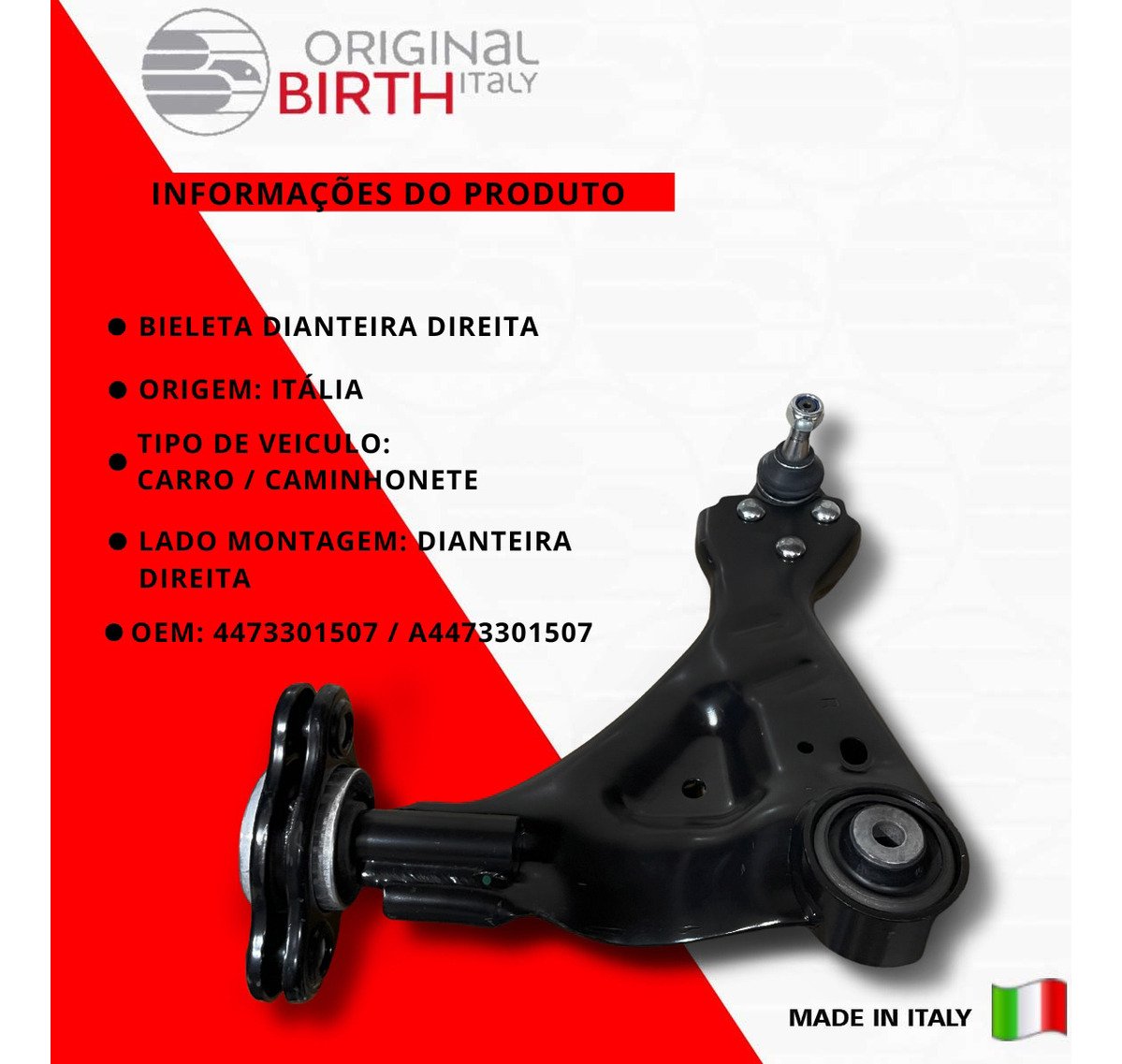 Descrição BANDEJA DIANTEIRA LADO DIREITO OBS BANDEJA DIANTEIRA LADO DIREITO COM PIVO MERCEDES VITO PASSAGEIRO W447 2014 A 2023 Marca Birth Origem Italia Detalhes do produto ORIGINAL BIRTH são peças de altíssima qualidade fabricada na Itália desde 1979, a ORIGINAL BIRTH é um líder de referência para o mercado com uma qualidade ampla de componentes para todos os modelos de automóveis em circulação. Nível extremo de confiabilidade, são 7,5 milhões de artigos vendidos todos os anos e com presença mundial em 65 países, nos 5 continentes! Somos distribuidor oficial do Brasil da Marca ORIGINAL BIRTH, Todas as peças são novas na caixa e com garantia. Escolha ORIGINAL BIRTH a qualidade vai te surpreender! Informações Complementares Tipo de braço de controle: Braço de controle Rosca externa: 2 M 16 x 1,5 mm Posição de montagem: Eixo dianteiro, direito Cilindrada: 16 mm Material: Aço laminado OEM 4473301507 / A4473301507