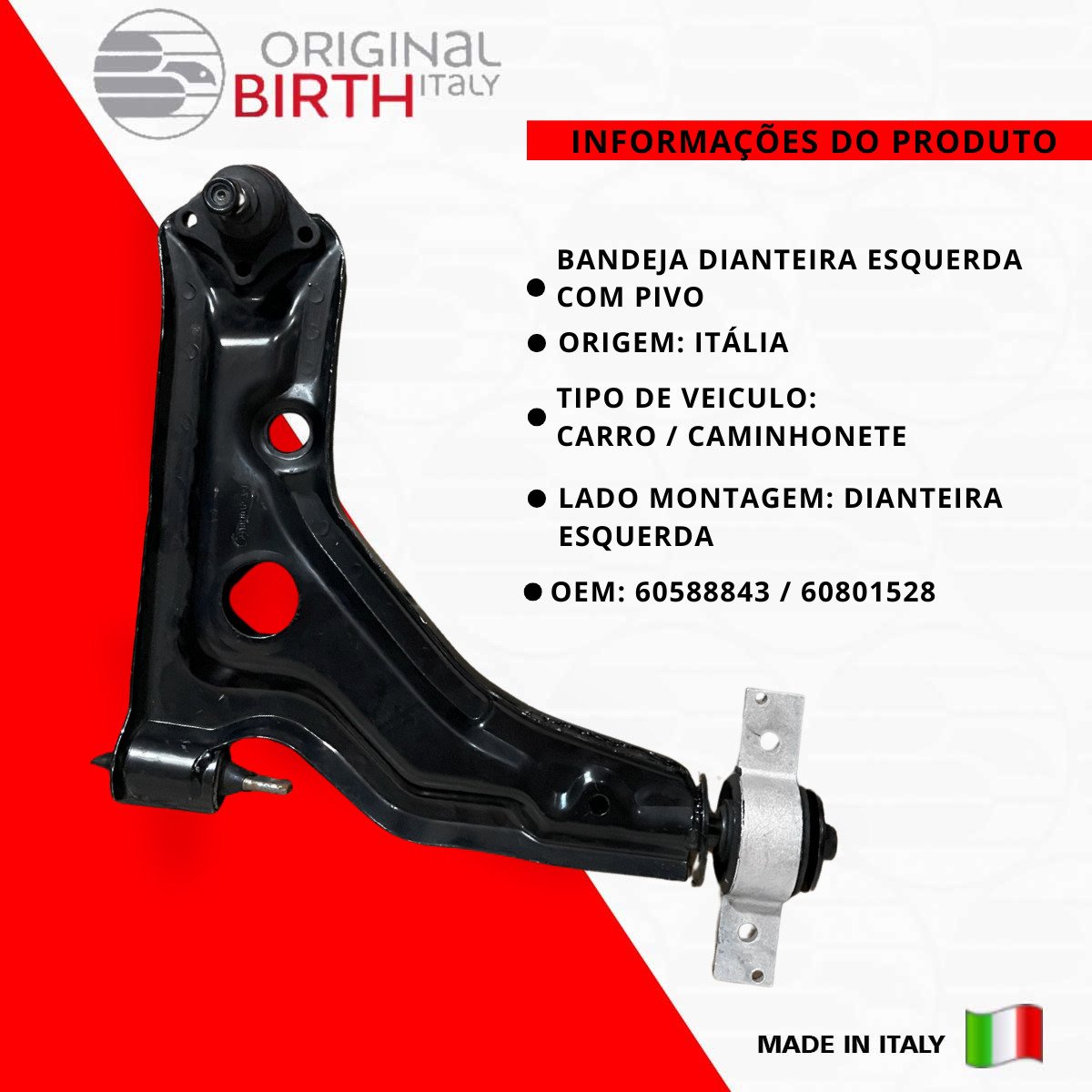 Descrição BANDEJA DIANTEIRA ESQUERDA COM PIVO Detalhes do produto ORIGINAL BIRTH são peças de altíssima qualidade fabricada na Itália desde 1979, a ORIGINAL BIRTH é um líder de referência para o mercado com uma qualidade ampla de componentes para todos os modelos de automóveis em circulação. Nível extremo de confiabilidade, são 7,5 milhões de artigos vendidos todos os anos e com presença mundial em 65 países, nos 5 continentes! Somos distribuidor oficial do Brasil da Marca ORIGINAL BIRTH, Todas as peças são novas na caixa e com garantia. Escolha ORIGINAL BIRTH a qualidade vai te surpreender! INFORMAÇÕES COMPLEMENTARES TIPO DE BRAÇO DE CONTROLE: BRAÇO DE CONTROLE ROSCA EXTERNA: 2 M 12 X 1,5 MM POSIÇÃO DE MONTAGEM: EIXO DIANTEIRO, ESQUERDO BITOLA CÔNICA: 15 MM MATERIAL: CHAPA DE AÇO Marca Birth Origem Italia OEM 60588843 / 60801528