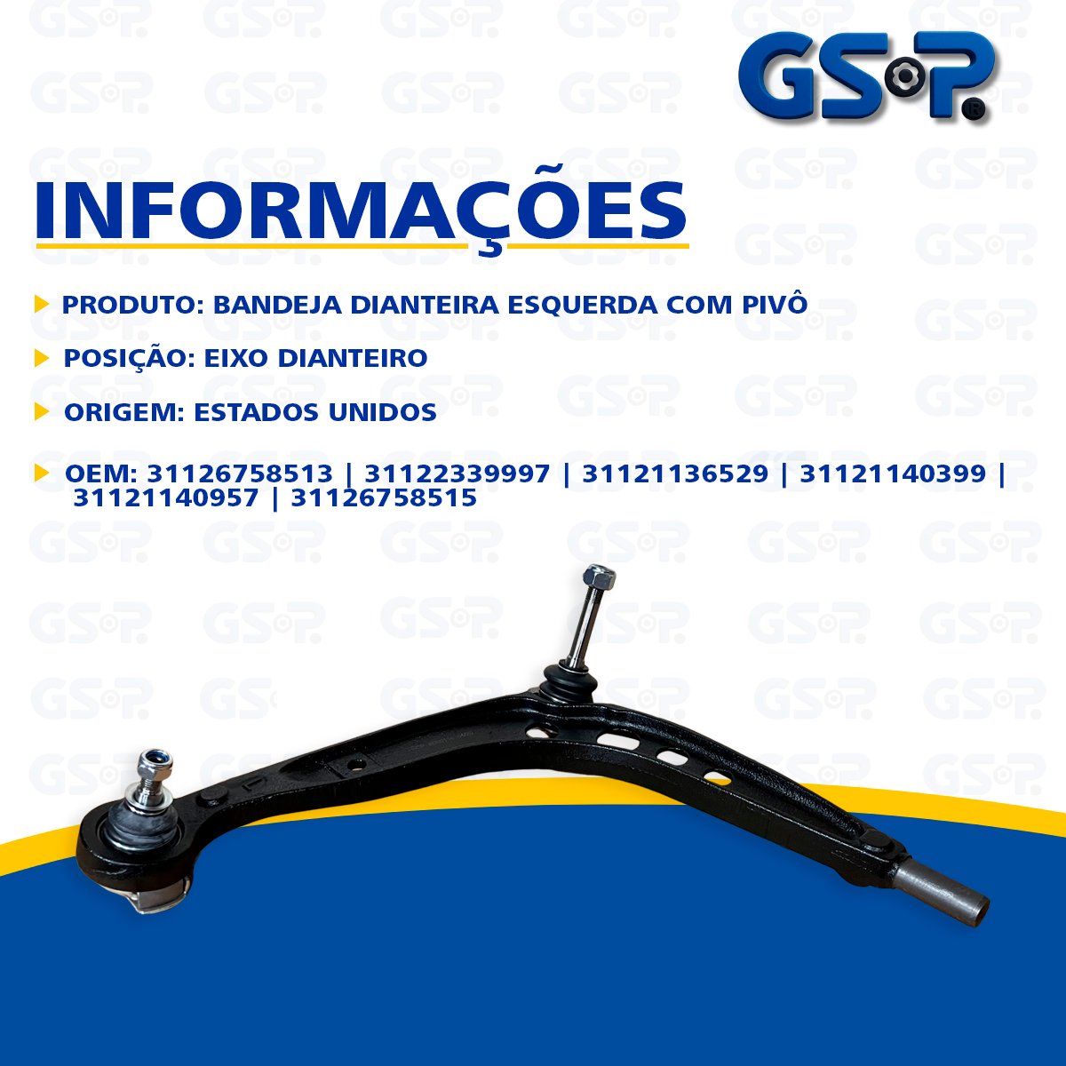 Descrição Bandeja Dianteira Esquerda com Pivô Marca GSP Origem Estados Unidos OEM 31126758513, 31122339997, 31121136529, 31121140399, 31121140957, 31126758515 OBS Não Acompanha Mancal