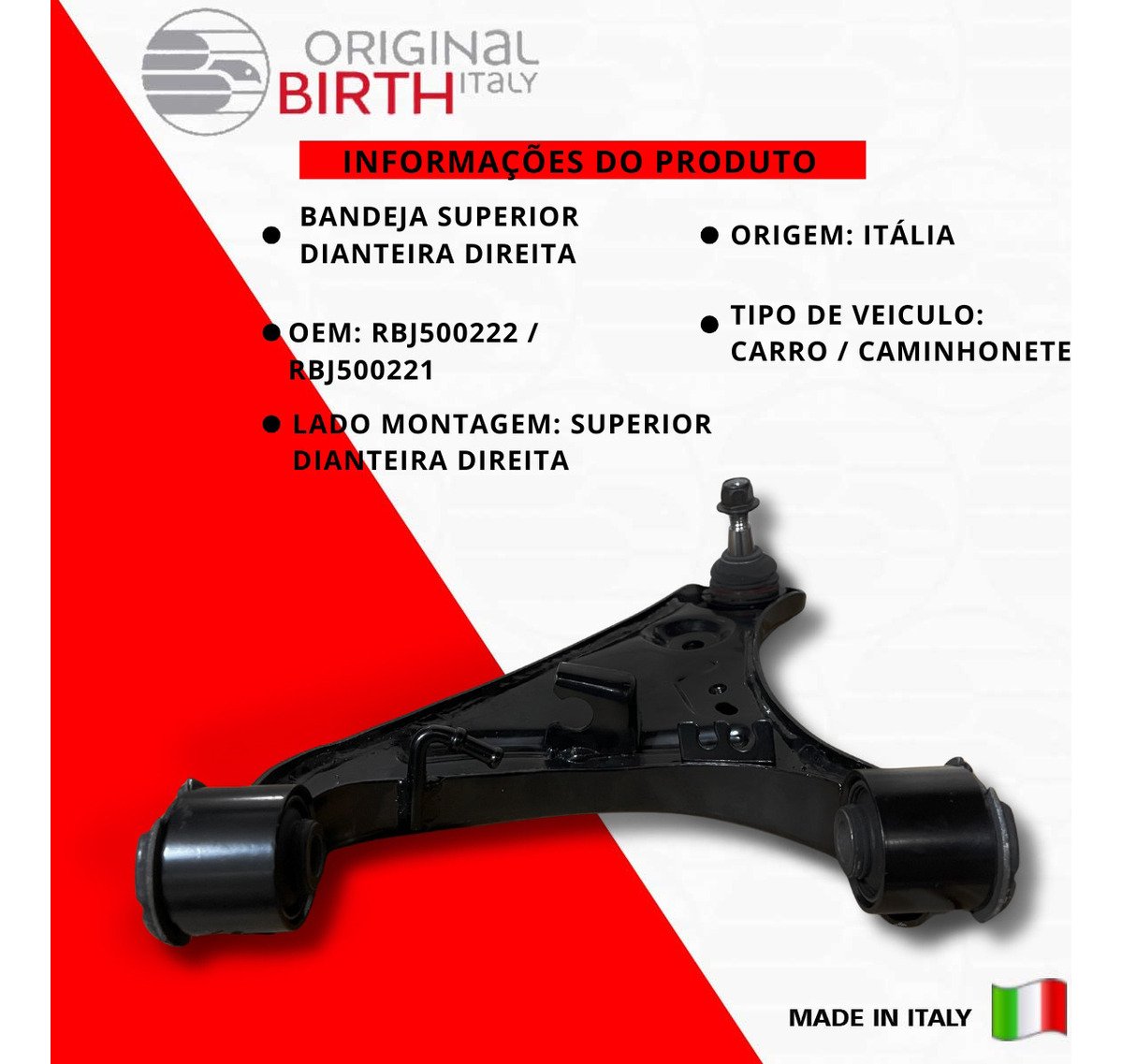 Descrição BANDEJA SUPERIOR DIANTEIRA LADO ESQUERDO OBS BANDEJA SUPERIOR DIANTEIRA LADO ESQUERDO ALTURA TOTAL PIVO 92MM Marca Birth Origem Italia Detalhes do produto ORIGINAL BIRTH são peças de altíssima qualidade fabricada na Itália desde 1979, a ORIGINAL BIRTH é um líder de referência para o mercado com uma qualidade ampla de componentes para todos os modelos de automóveis em circulação. Nível extremo de confiabilidade, são 7,5 milhões de artigos vendidos todos os anos e com presença mundial em 65 países, nos 5 continentes! Somos distribuidor oficial do Brasil da Marca ORIGINAL BIRTH, Todas as peças são novas na caixa e com garantia. Escolha ORIGINAL BIRTH a qualidade vai te surpreender! Informações Complementares Tipo de braço de controle: Braço de controle Rosca externa: 2 M 12 x 1,75 mm Posição de montagem: Eixo dianteiro, esquerdo, superior Cilindrada: 14 mm Material: Aço laminado OEM RBJ500232 / RBJ500231