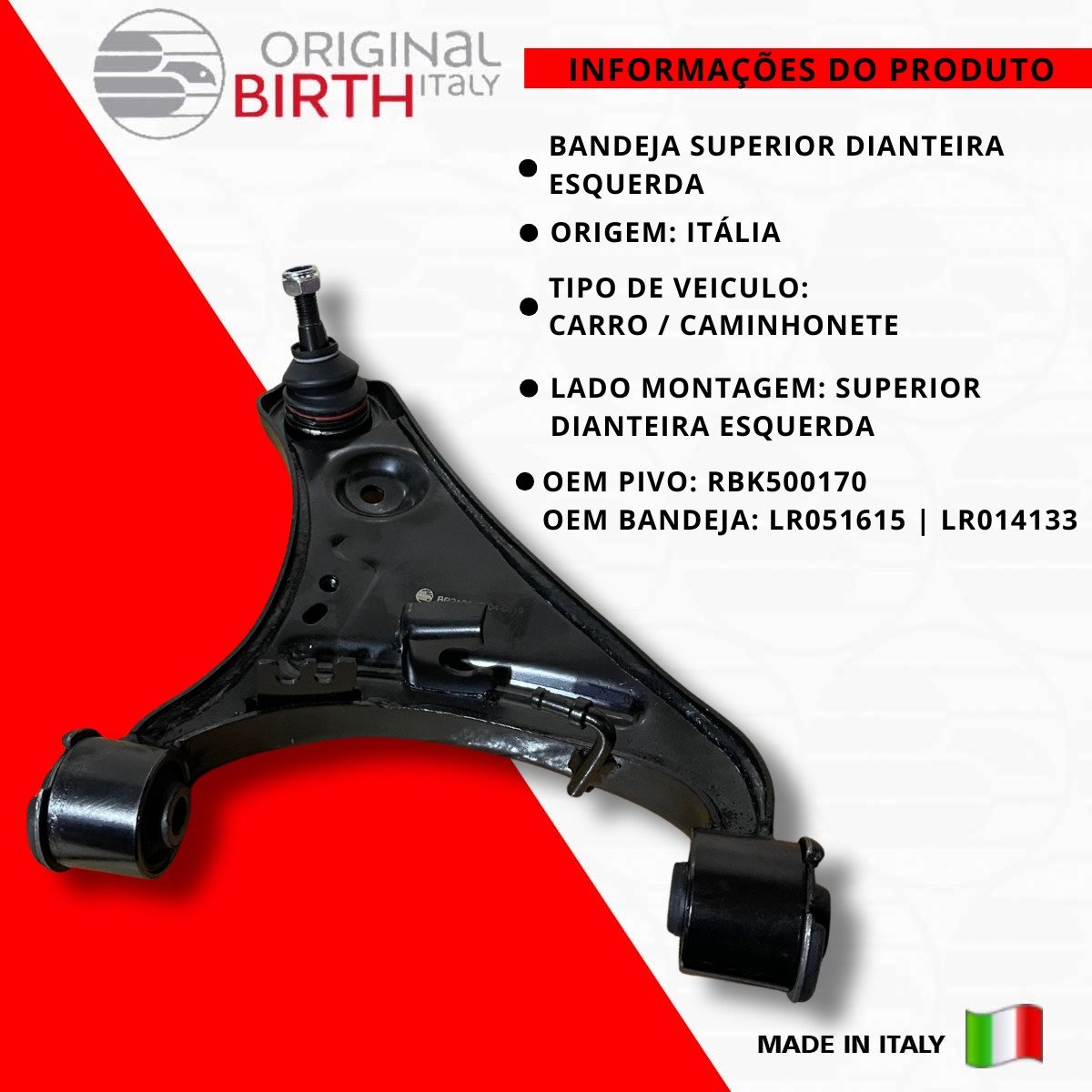 Descrição BANDEJA SUPERIOR DIANTEIRA ESQUERDA OBS BANDEJA SUPERIOR DIANTEIRA ESQUERDA (NAO APLICA EM MOTOR 5.0) ALTURA TOTAL DO PIVO 104MM Marca Birth Origem Italia Detalhes do produto ORIGINAL BIRTH são peças de altíssima qualidade fabricada na Itália desde 1979, a ORIGINAL BIRTH é um líder de referência para o mercado com uma qualidade ampla de componentes para todos os modelos de automóveis em circulação. Nível extremo de confiabilidade, são 7,5 milhões de artigos vendidos todos os anos e com presença mundial em 65 países, nos 5 continentes! Somos distribuidor oficial do Brasil da Marca ORIGINAL BIRTH, Todas as peças são novas na caixa e com garantia. Escolha ORIGINAL BIRTH a qualidade vai te surpreender! Informações Complementares TIPO DE BRAÇO DE CONTROLE: BRAÇO DE CONTROLE ROSCA EXTERNA: 2 M 12 X 1,75 MM POSIÇÃO DE MONTAGEM: EIXO DIANTEIRO, ESQUERDO, SUPERIOR CILINDRADA: 14 MM MATERIAL: AÇO LAMINADO OEM PIVO RBK500170 OEM BANDEJA LR051615 | LR014133