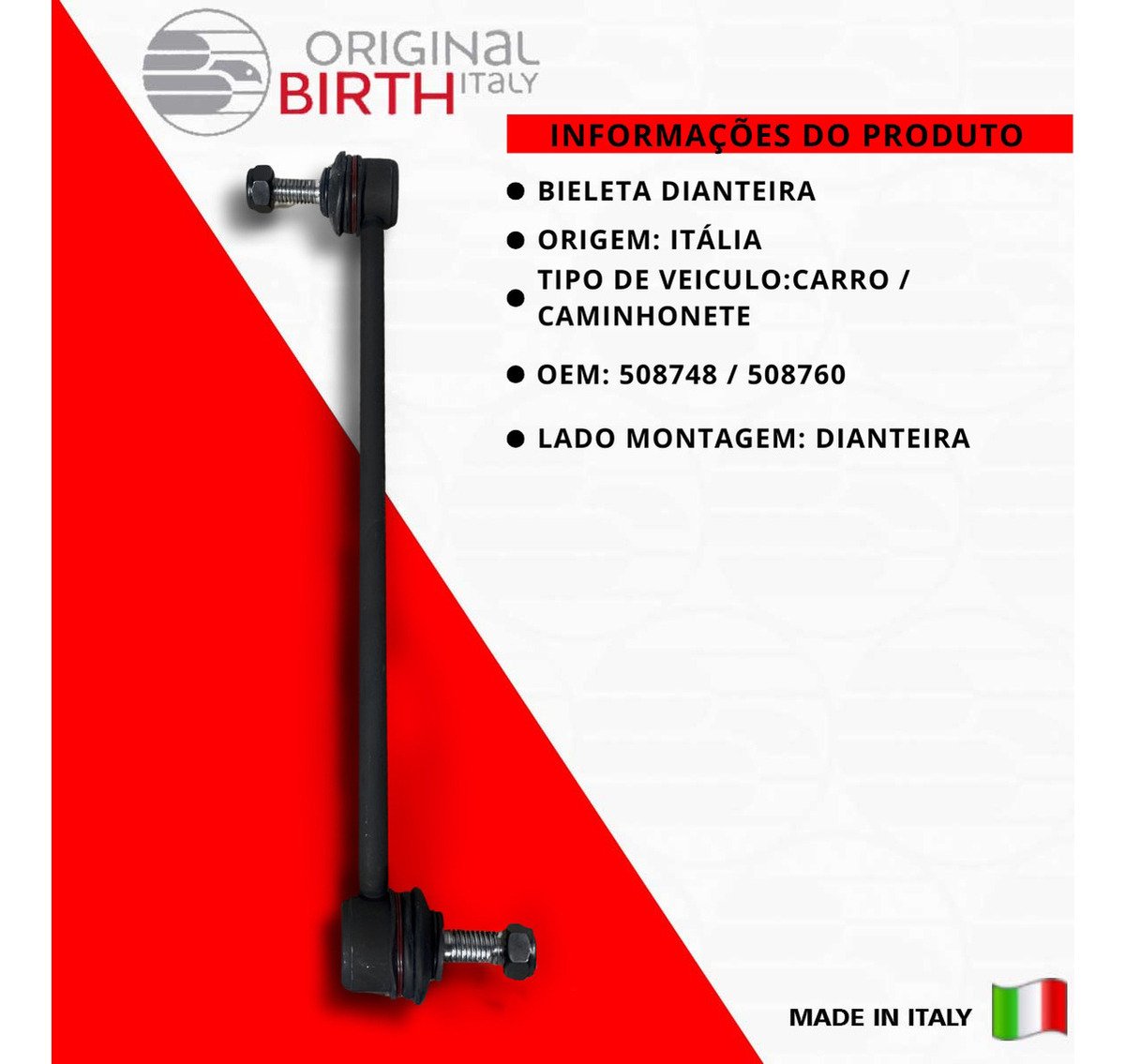 Descrição BIELETA DIANTEIRA OBS APLICA AMBOS OS LADOS Marca Birth Origem Italia Detalhes do produto ORIGINAL BIRTH são peças de altíssima qualidade fabricada na Itália desde 1979, a ORIGINAL BIRTH é um líder de referência para o mercado com uma qualidade ampla de componentes para todos os modelos de automóveis em circulação. Nível extremo de confiabilidade, são 7,5 milhões de artigos vendidos todos os anos e com presença mundial em 65 países, nos 5 continentes! Somos distribuidor oficial do Brasil da Marca ORIGINAL BIRTH, Todas as peças são novas na caixa e com garantia. Escolha ORIGINAL BIRTH a qualidade vai te surpreender! Informações Complementares INFORMAÇÕES COMPLEMENTARES: Barra de direção/Mola Rosca externa 2 M 12x1,75 mm Lado de montagem: Eixo dianteiro esquerdo, Eixo dianteiro direito OEM 508748 / 508760
