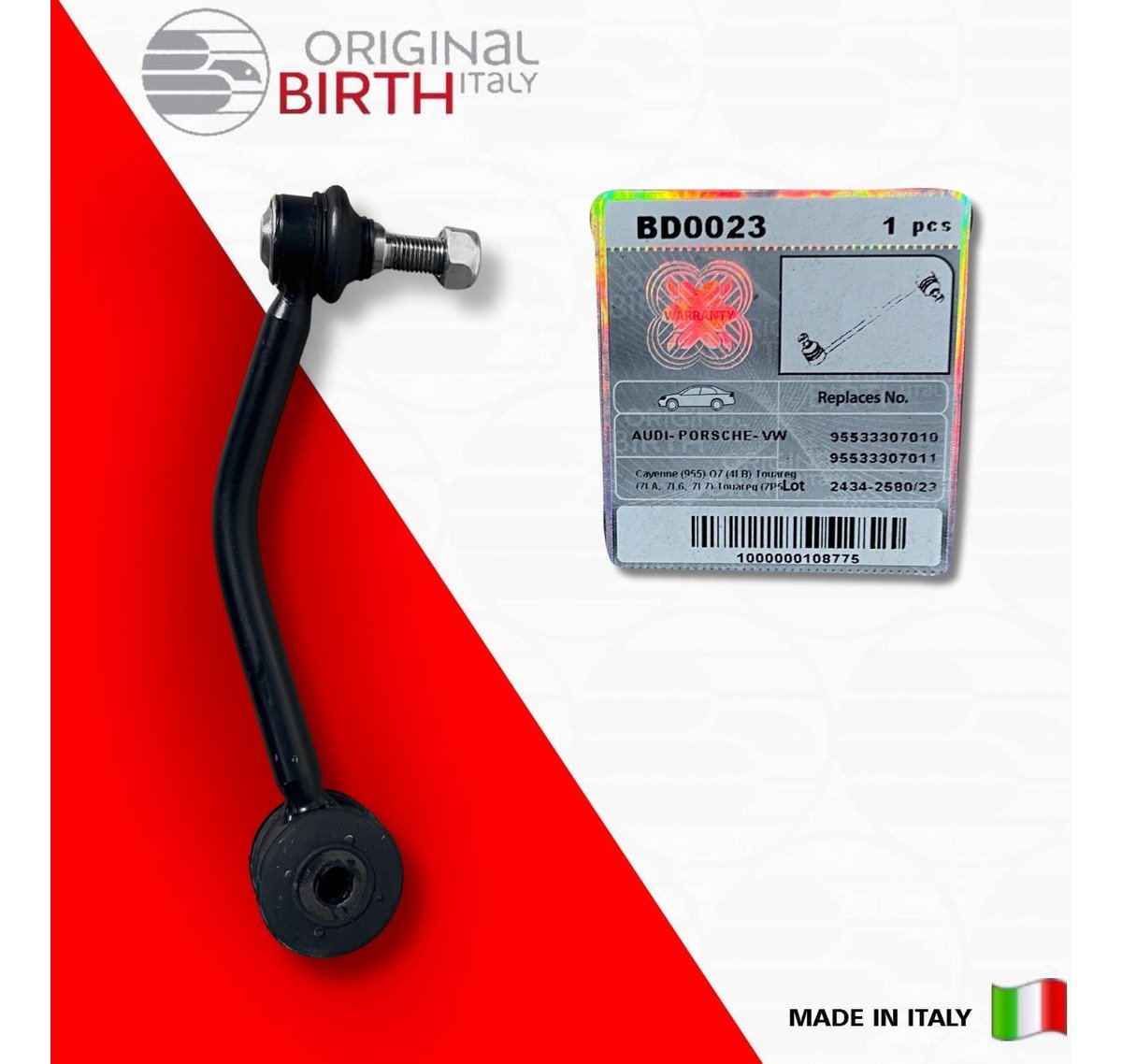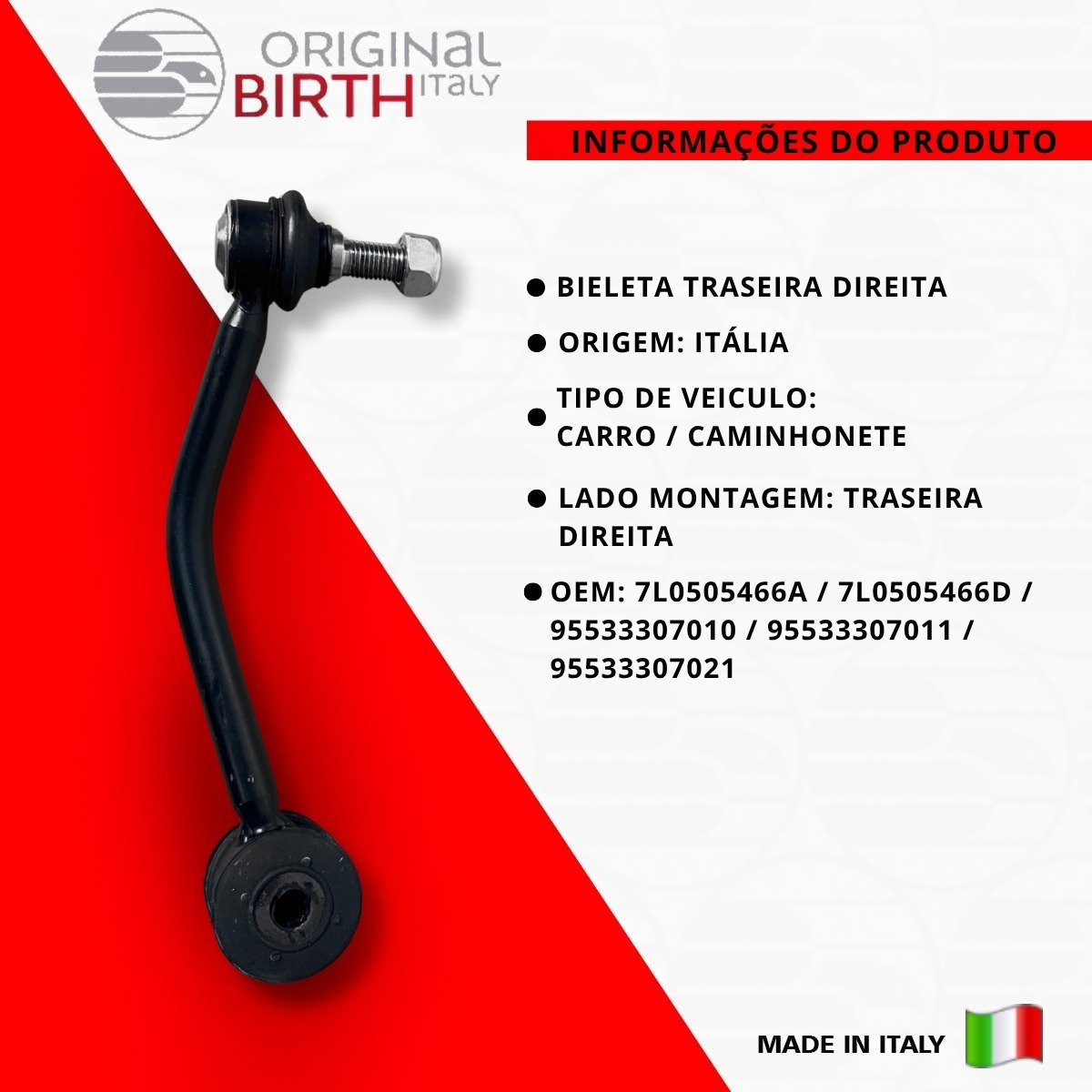 Descrição BIELETA TRASEIRA DIREITA Detalhes do produto ORIGINAL BIRTH são peças de altíssima qualidade fabricada na Itália desde 1979, a ORIGINAL BIRTH é um líder de referência para o mercado com uma qualidade ampla de componentes para todos os modelos de automóveis em circulação. Nível extremo de confiabilidade, são 7,5 milhões de artigos vendidos todos os anos e com presença mundial em 65 países, nos 5 continentes! Somos distribuidor oficial do Brasil da Marca ORIGINAL BIRTH, Todas as peças são novas na caixa e com garantia. Escolha ORIGINAL BIRTH a qualidade vai te surpreender! INFORMAÇÕES COMPLEMENTARES Comprimento: 2200,5 mm Rosca Externa: 2 M 12x1,5 mm Lado de Montagem: Eixo Traseiro Direito Diâmetro Interno: 12 mm Marca Birth Origem Italia OEM 7L0505466A / 7L0505466D / 95533307010 / 95533307011 / 95533307021
