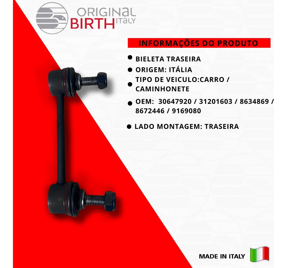 Descrição BIELETA TRASEIRA Marca Birth Origem Italia Detalhes do produto ORIGINAL BIRTH são peças de altíssima qualidade fabricada na Itália desde 1979, a ORIGINAL BIRTH é um líder de referência para o mercado com uma qualidade ampla de componentes para todos os modelos de automóveis em circulação. Nível extremo de confiabilidade, são 7,5 milhões de artigos vendidos todos os anos e com presença mundial em 65 países, nos 5 continentes! Somos distribuidor oficial do Brasil da Marca ORIGINAL BIRTH, Todas as peças são novas na caixa e com garantia. Escolha ORIGINAL BIRTH a qualidade vai te surpreender! Informações Complementares INFORMAÇÕES COMPLEMENTARES: Barra de direção/Mola Rosca externa: 2 M 12x1,75 mm Lado de montagem: Eixo traseiro OEM 30647920 / 31201603 / 8634869 / 8672446 / 9169080