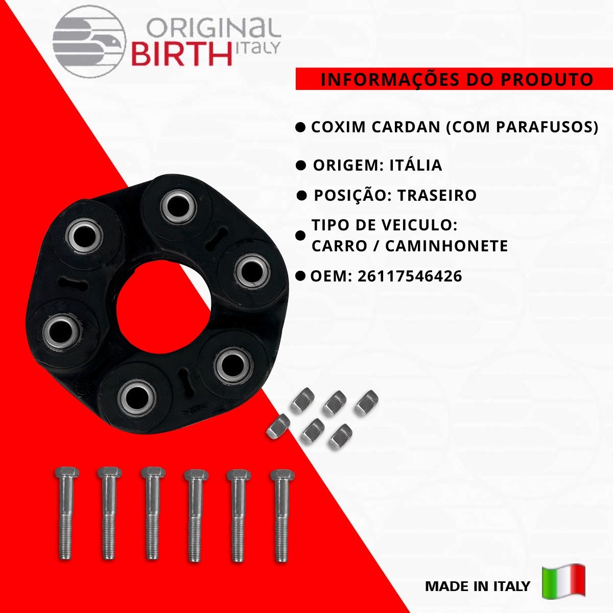 Descrição COXIM CARDAN (COM PARAFUSOS) OBS 151MM X 38.5,MM / FURO CENTRAL 56,5MM Marca Birth INFORMAÇÕES COMPLEMENTARES EIXO TRASEIRO DIÂMETRO INTERNO 56,5 MM ÍNDICE DE DUREZA SHORE-A DO CORPO PRINCIPAL: 70 Detalhes do produto ORIGINAL BIRTH são peças de altíssima qualidade fabricada na Itália desde 1979, a ORIGINAL BIRTH é um líder de referência para o mercado com uma qualidade ampla de componentes para todos os modelos de automóveis em circulação. Nível extremo de confiabilidade, são 7,5 milhões de artigos vendidos todos os anos e com presença mundial em 65 países, nos 5 continentes! Somos distribuidor oficial do Brasil da Marca ORIGINAL BIRTH, Todas as peças são novas na caixa e com garantia. Escolha ORIGINAL BIRTH a qualidade vai te surpreender! Origem Italia OEM 26117546426