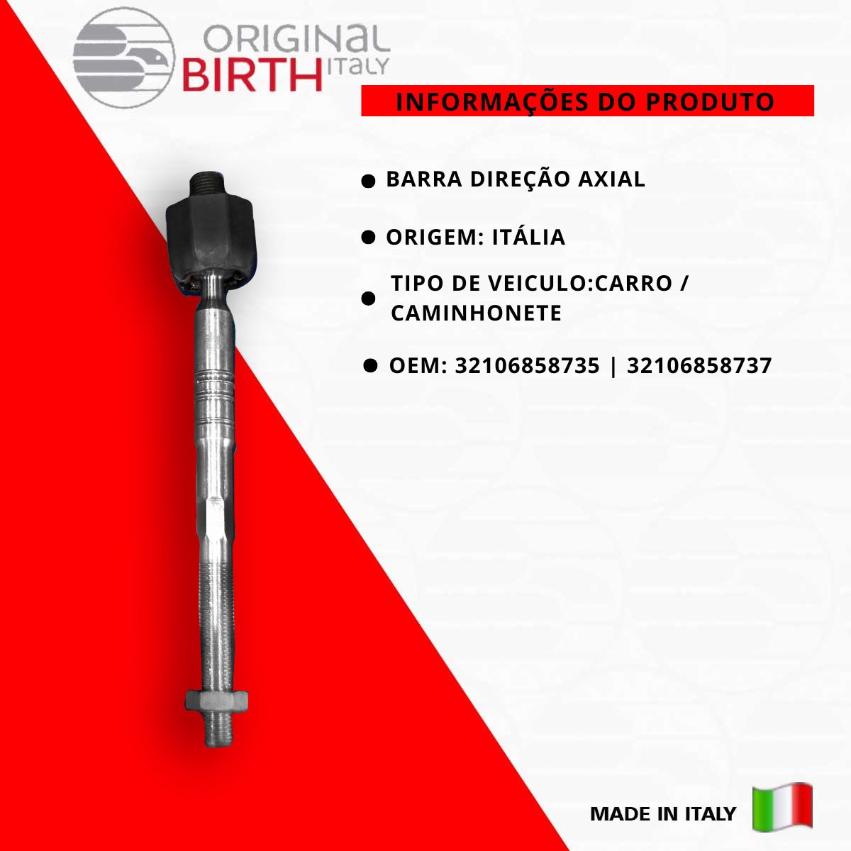 Descrição BARRA DE DIREÇÃO AXIAL Marca Birth Origem Italia OEM 32106858735 | 32106858737 Detalhes do produto ORIGINAL BIRTH são peças de altíssima qualidade fabricada na Itália desde 1979, a ORIGINAL BIRTH é um líder de referência para o mercado com uma qualidade ampla de componentes para todos os modelos de automóveis em circulação. Nível extremo de confiabilidade, são 7,5 milhões de artigos vendidos todos os anos e com presença mundial em 65 países, nos 5 continentes! Somos distribuidor oficial do Brasil da Marca ORIGINAL BIRTH, Todas as peças são novas na caixa e com garantia. Escolha ORIGINAL BIRTH a qualidade vai te surpreender!