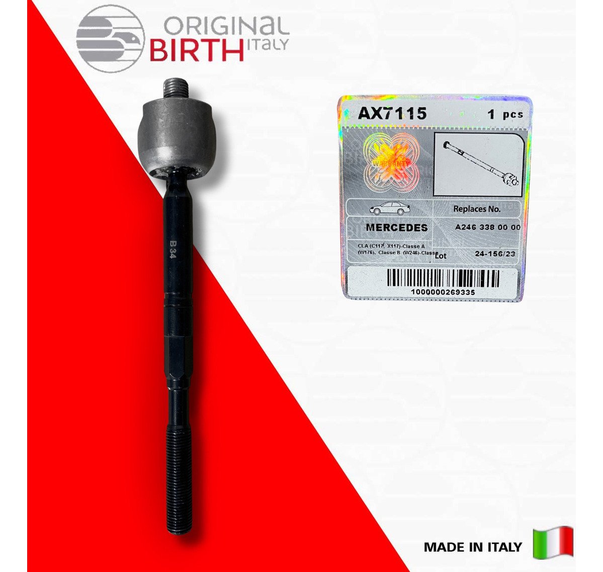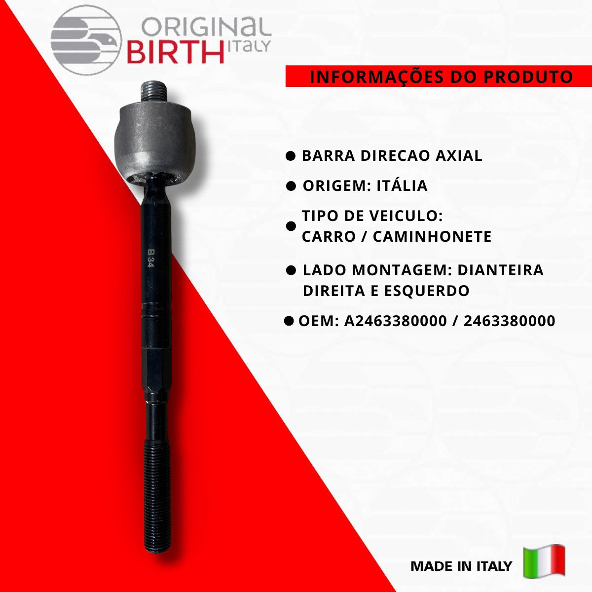 Descrição BARRA DIREÇÃO AXIAL Detalhes do produto ORIGINAL BIRTH são peças de altíssima qualidade fabricada na Itália desde 1979, a ORIGINAL BIRTH é um líder de referência para o mercado com uma qualidade ampla de componentes para todos os modelos de automóveis em circulação. Nível extremo de confiabilidade, são 7,5 milhões de artigos vendidos todos os anos e com presença mundial em 65 países, nos 5 continentes! Somos distribuidor oficial do Brasil da Marca ORIGINAL BIRTH, Todas as peças são novas na caixa e com garantia. Escolha ORIGINAL BIRTH a qualidade vai te surpreender! INFORMAÇÕES COMPLEMENTARES COMPRIMENTO: 222 MM COMPRIMENTO: 238 MM ROSCA EXTERNA: 1 M 14X1,5 MM ROSCA EXTERNA: 2 M 14X1,5 MM LADO DE MONTAGEM: EIXO DIANTEIRO ESQUERDO, EIXO DIANTEIRO DIREITO Marca Birth Origem Italia OEM A2463380000 / 2463380000