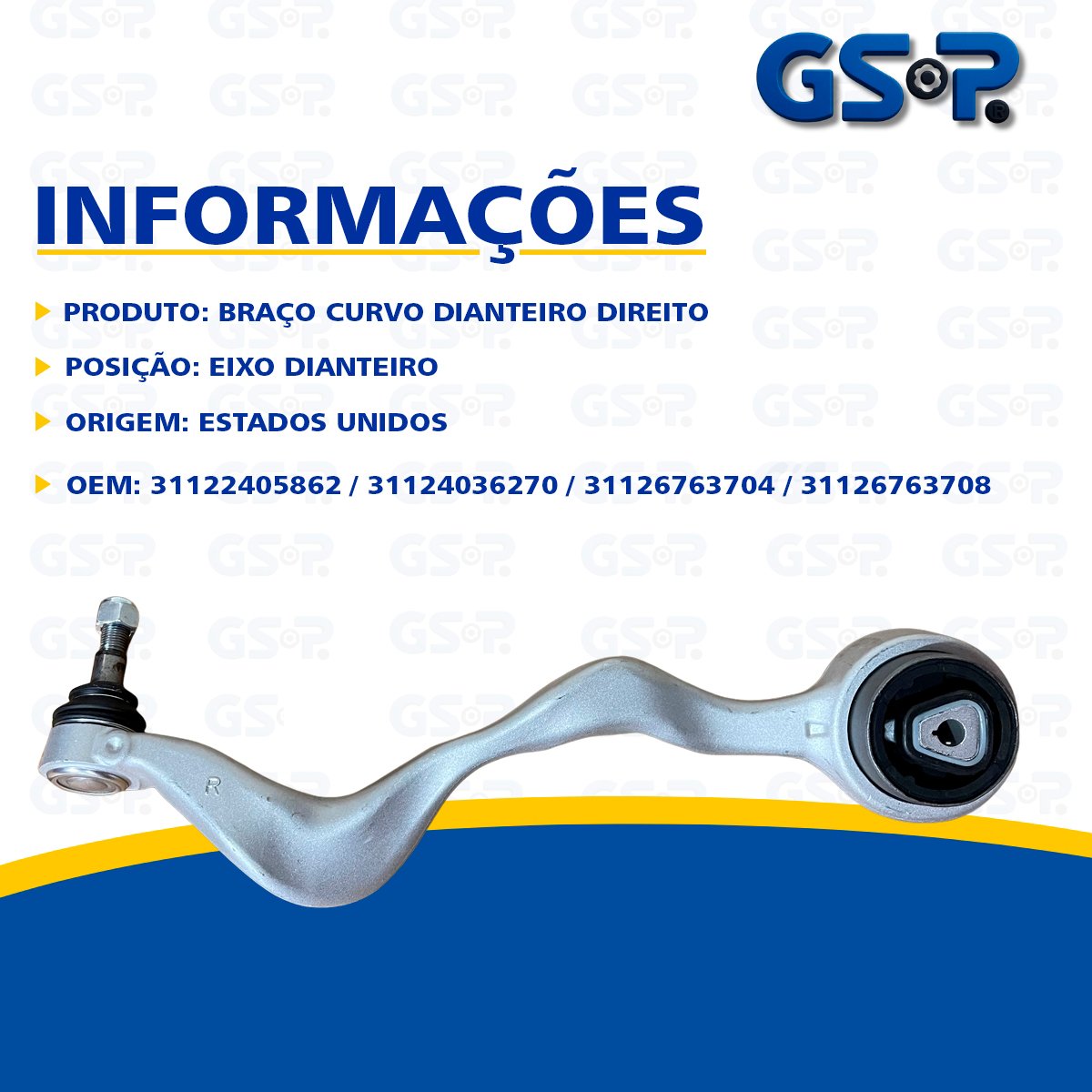 Descrição Braço Curvo Dianteiro Direito Marca GSP Origem Estados Unidos OEM 31122405862 / 31124036270 / 31126763704 / 31126763708 / 31126769798 / 31126769802 / 31122409598 / 31112763704 / 31124036720 / 30517