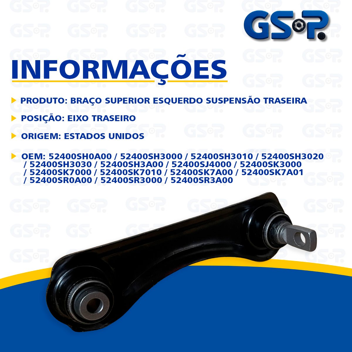 Descrição Braço Superior Suspensão Traseira Lado Esquerdo Marca GSP Origem Estados Unidos OEM 52400SH0A00 / 52400SH3000 / 52400SH3010 / 52400SH3020 / 52400SH3030 / 52400SH3A00 / 52400SJ4000 / 52400SK3000 / 52400SK7000 / 52400SK7010 / 52400SK7A00 / 52400SK7A01 / 52400SR0A00 / 52400SR3000 / 52400SR3A00