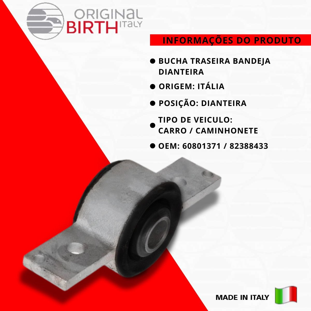 Descrição BUCHA TRASEIRA BANDEJA DIANTEIRA Marca Birth INFORMAÇÕES COMPLEMENTARES Eixo dianteiro esquerdo Eixo dianteiro direito Diâmetro interno: 19 mm Detalhes do produto ORIGINAL BIRTH são peças de altíssima qualidade fabricada na Itália desde 1979, a ORIGINAL BIRTH é um líder de referência para o mercado com uma qualidade ampla de componentes para todos os modelos de automóveis em circulação. Nível extremo de confiabilidade, são 7,5 milhões de artigos vendidos todos os anos e com presença mundial em 65 países, nos 5 continentes! Somos distribuidor oficial do Brasil da Marca ORIGINAL BIRTH, Todas as peças são novas na caixa e com garantia. Escolha ORIGINAL BIRTH a qualidade vai te surpreender! Origem Italia OEM 60801371 / 82388433