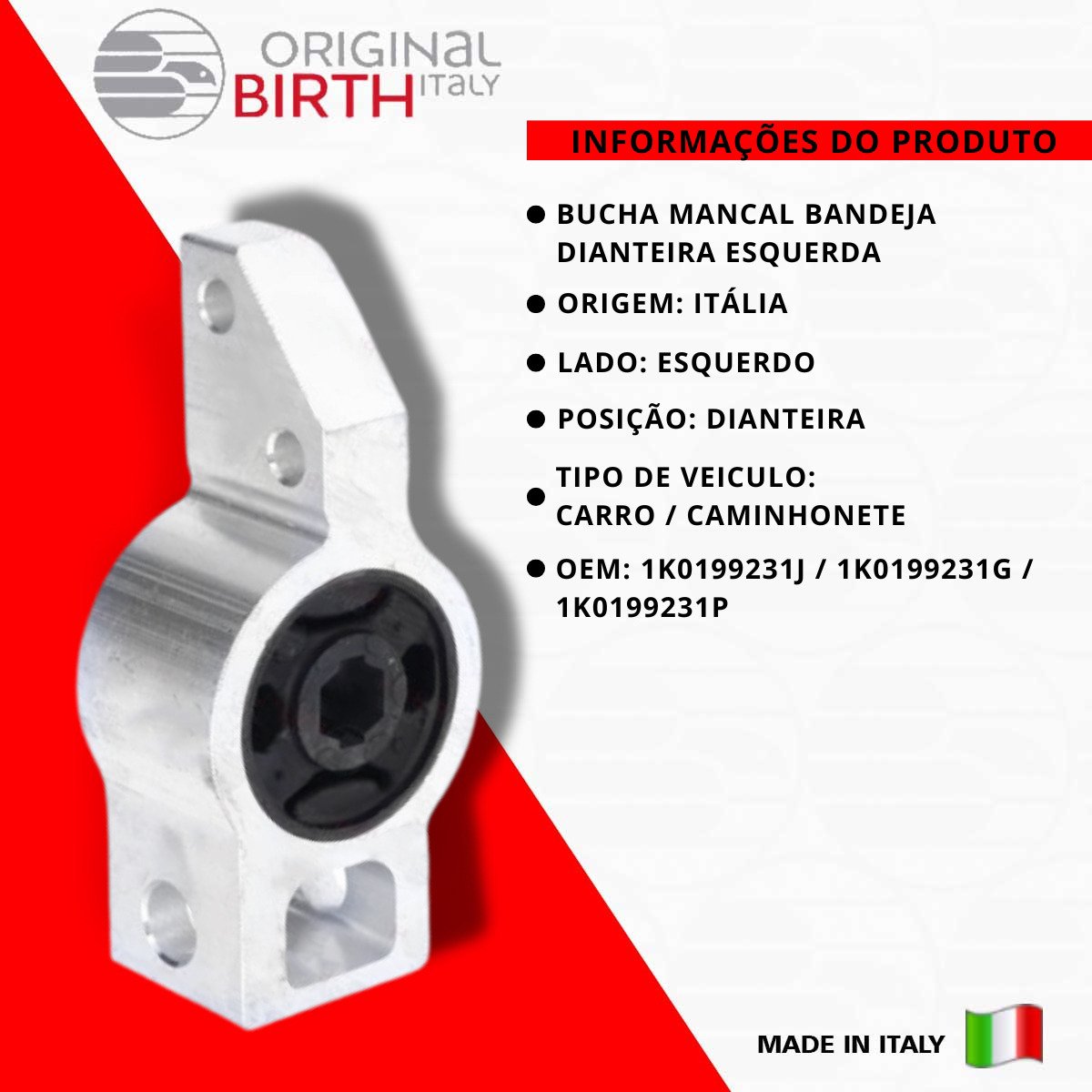 Descrição BUCHA MANCAL BANDEJA DIANTEIRA ESQUERDA Marca Birth Detalhes do produto ORIGINAL BIRTH são peças de altíssima qualidade fabricada na Itália desde 1979, a ORIGINAL BIRTH é um líder de referência para o mercado com uma qualidade ampla de componentes para todos os modelos de automóveis em circulação. Nível extremo de confiabilidade, são 7,5 milhões de artigos vendidos todos os anos e com presença mundial em 65 países, nos 5 continentes! Somos distribuidor oficial do Brasil da Marca ORIGINAL BIRTH, Todas as peças são novas na caixa e com garantia. Escolha ORIGINAL BIRTH a qualidade vai te surpreender! INFORMAÇÕES COMPLEMENTARES LADO DE MONTAGEM: EIXO DIANTEIRO ESQUERDO DIAMETRO INTERNO: 18,6 mm ÍNDICE DE DUREZA SHORE-A DO CORPO PRINCIPAL: 70 Origem Italia OEM 1K0199231J / 1K0199231G / 1K0199231P