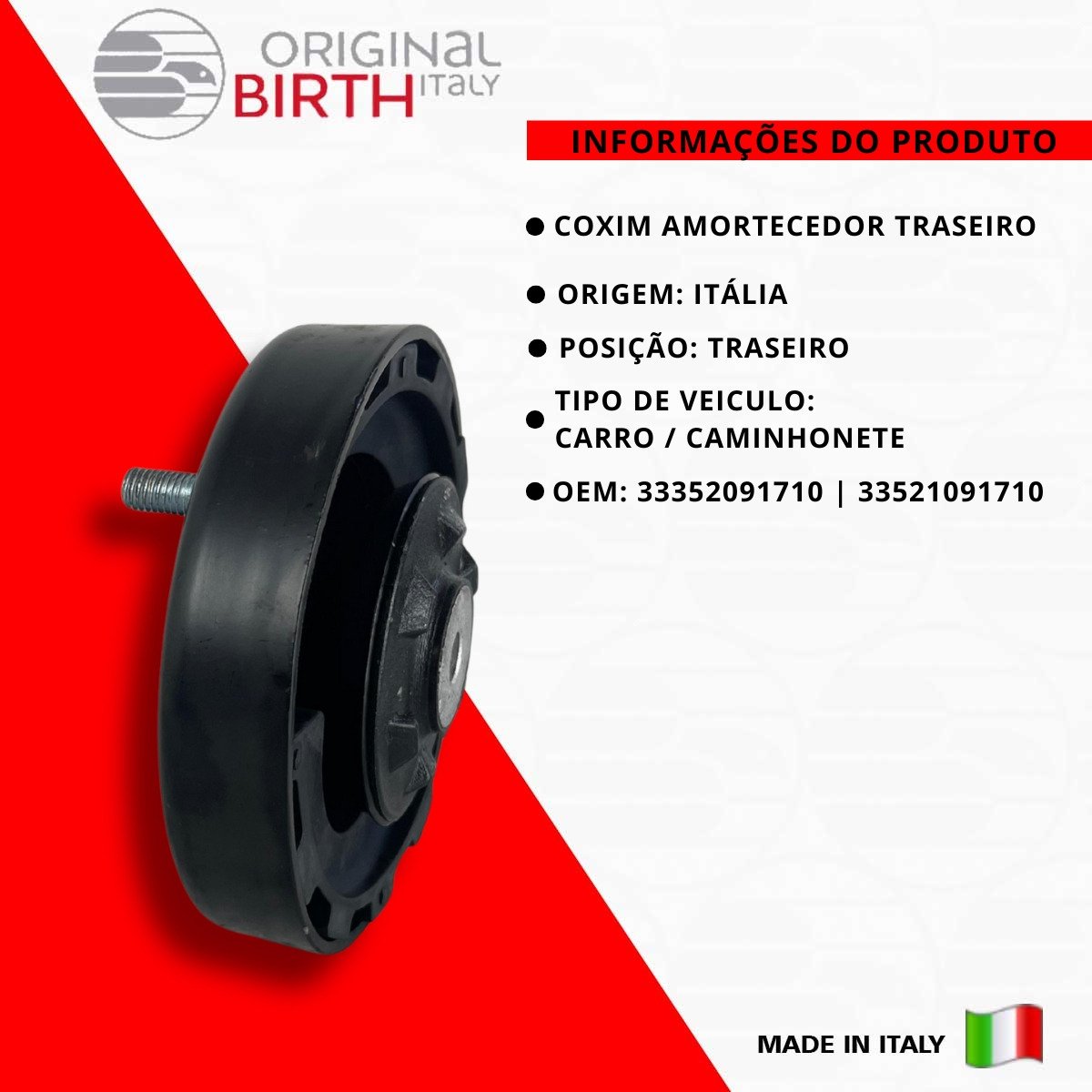 Descrição COXIM AMORTECEDOR TRASEIRO OBS 151MM X 38.5,MM / FURO CENTRAL 56,5MM Marca Birth INFORMAÇÕES COMPLEMENTARES LADO DE MONTAGEM: EIXO TRASEIRO / AMBOS OS LADOS DIÂMETRO INTERNO: 10 MM ÍNDICE DE DUREZA SHORE-A, CORPO PRINCIPAL: 55 Detalhes do produto ORIGINAL BIRTH são peças de altíssima qualidade fabricada na Itália desde 1979, a ORIGINAL BIRTH é um líder de referência para o mercado com uma qualidade ampla de componentes para todos os modelos de automóveis em circulação. Nível extremo de confiabilidade, são 7,5 milhões de artigos vendidos todos os anos e com presença mundial em 65 países, nos 5 continentes! Somos distribuidor oficial do Brasil da Marca ORIGINAL BIRTH, Todas as peças são novas na caixa e com garantia. Escolha ORIGINAL BIRTH a qualidade vai te surpreender! Origem Italia OEM 33352091710 | 33521091710