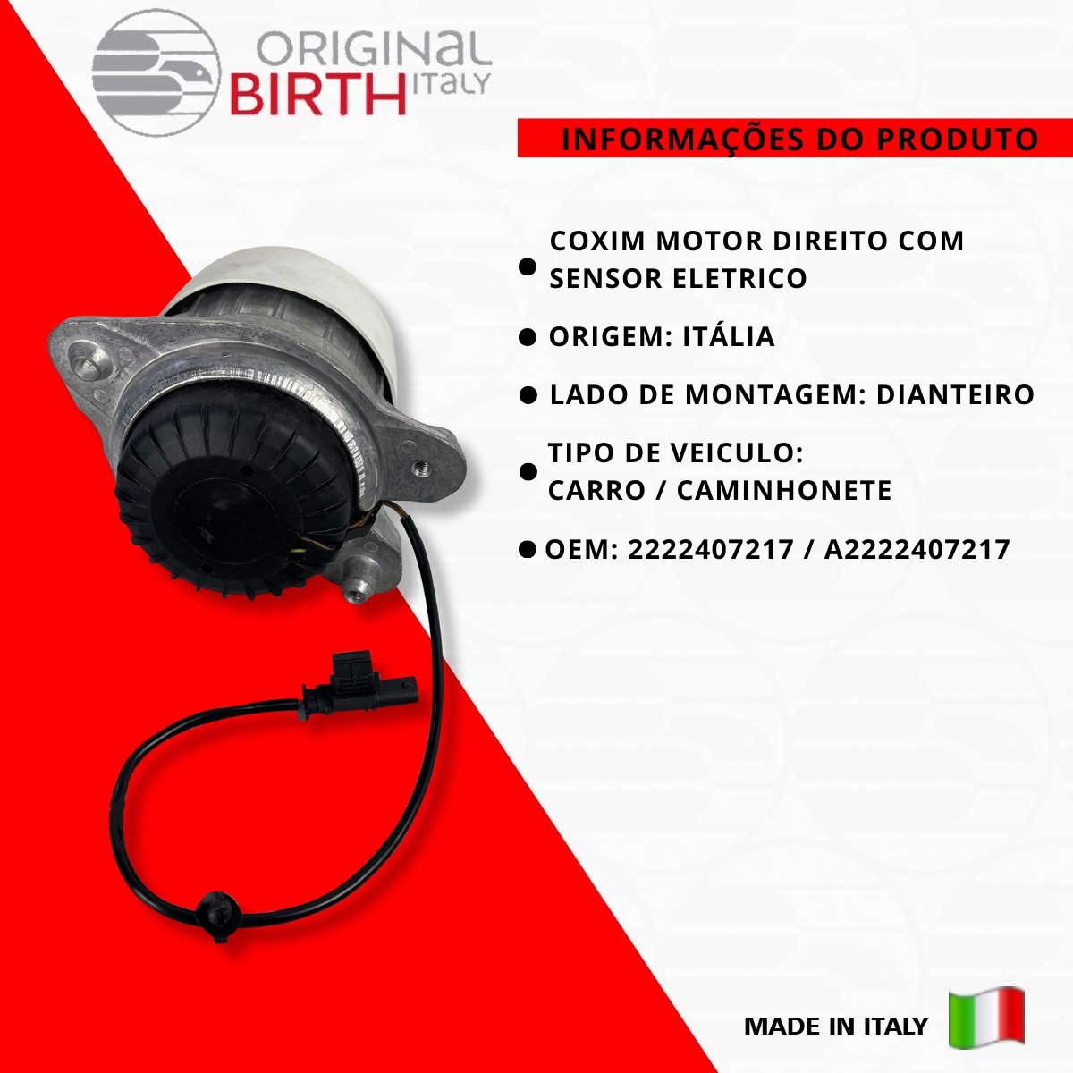 Descrição COXIM MOTOR DIREITO COM SENSOR ELETRICO OBS COXIM MOTOR DIREITO COM SENSOR ELETRICO Detalhes do produto ORIGINAL BIRTH são peças de altíssima qualidade fabricada na Itália desde 1979, a ORIGINAL BIRTH é um líder de referência para o mercado com uma qualidade ampla de componentes para todos os modelos de automóveis em circulação. Nível extremo de confiabilidade, são 7,5 milhões de artigos vendidos todos os anos e com presença mundial em 65 países, nos 5 continentes! Somos distribuidor oficial do Brasil da Marca ORIGINAL BIRTH, Todas as peças são novas na caixa e com garantia. Escolha ORIGINAL BIRTH a qualidade vai te surpreender! INFORMAÇÕES COMPLEMENTARES LADO DE MONTAGEM: EIXO DIANTEIRO DIREITO, SUPERIOR Marca Birth Origem Italia OEM 2222407217 / A2222407217