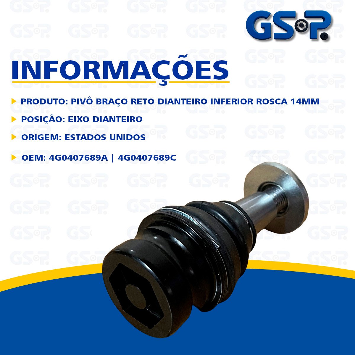 Descrição Pivô Braço Reto Marca GSP Origem Estados Unidos Medida do cone 17,4 mm Diâmetro 42 mm Medida da rosca MM14x1,5R OEM 4G0407689A | 4G0407689C