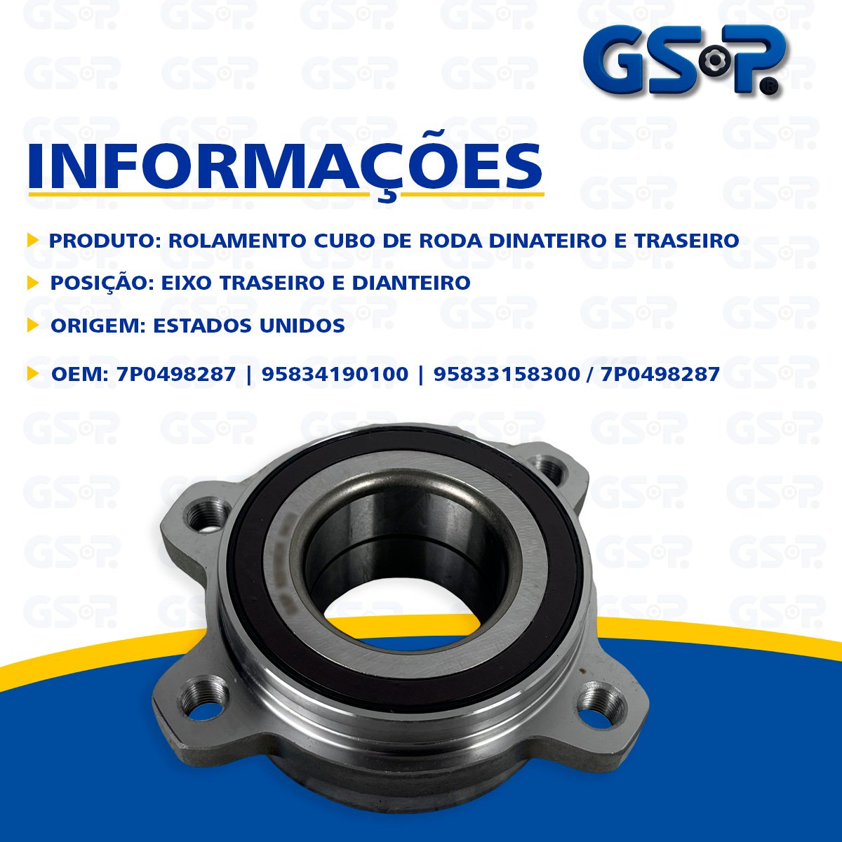 Descrição Rolamento do Cubo da Roda Marca GSP Origem Estados Unidos OEM 7P0498287 | 95834190100 | 95833158300 / 7P0498287 / 95834190100 / 95833158300
