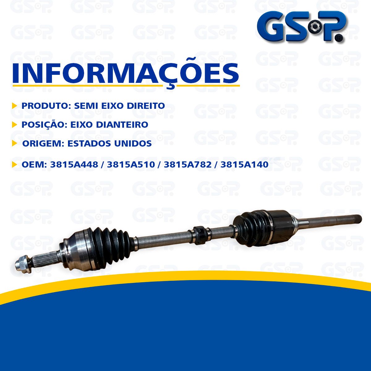 Descrição A GSP é uma das principais fabricantes de peças automotivas para o mercado de reposição mundial. Desde 1985, a empresa se destaca na produção de juntas de velocidade constante, eixos de acionamento, conjuntos de cubos, peças de borracha para metal, além de componentes de direção e suspensão. Com mais de 35 anos de experiência no setor automotivo, a GSP possui centros de distribuição estrategicamente localizados na América do Norte e na Alemanha, garantindo qualidade e eficiência no atendimento ao mercado global. Escolha GSP e surpreenda-se com a qualidade! Marca GSP Origem Estados Unidos OEM 3815A448 / 3815A510 / 3815A782 / 3815A140 OBS 982MM / DENTES LADO CAMBIO 30 / DENTES LADO RODA 28