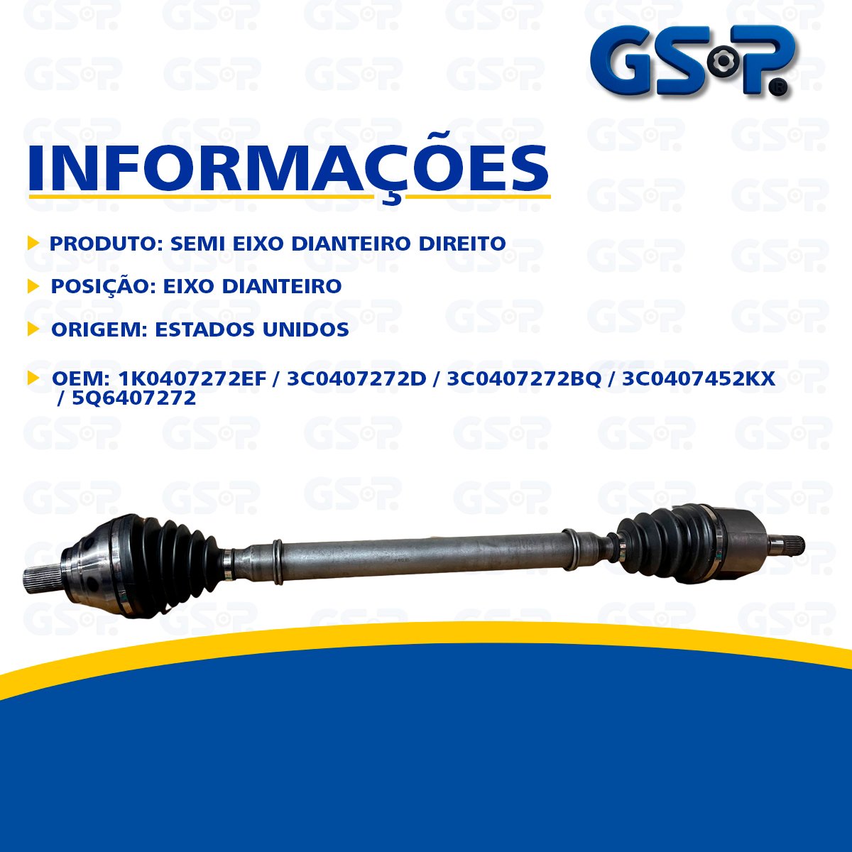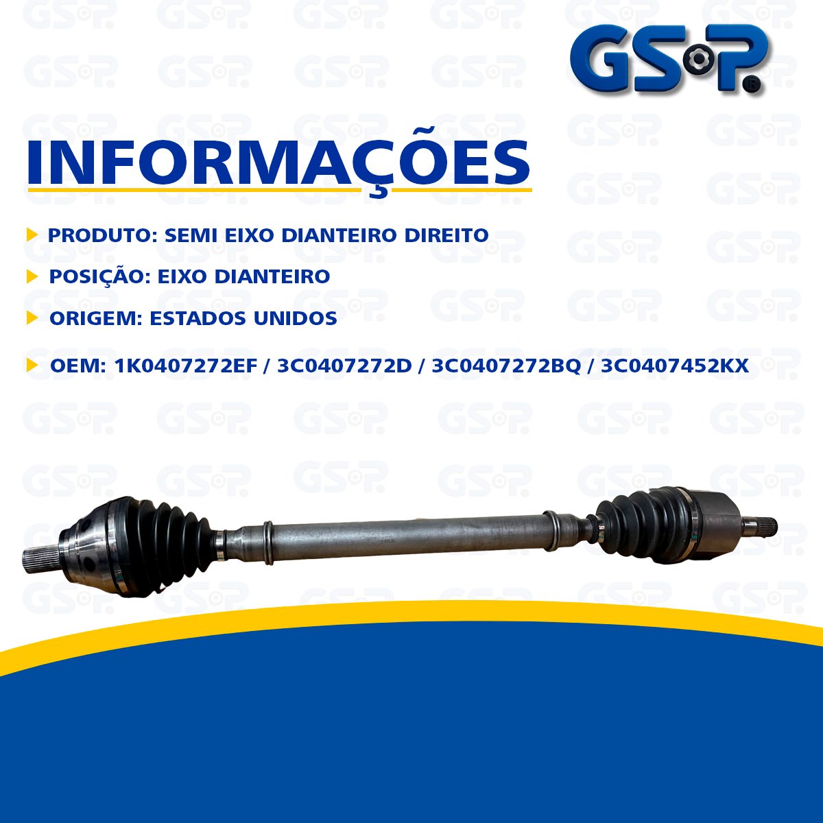 Descrição Semi Eixo Dianteiro Lado Direito Marca GSP Origem Estados Unidos OEM 1K0407272EF / 3C0407272D / 3C0407272BQ / 3C0407452KX / 5Q6407272 COMPRIMENTO 873MM DENTES LADO RODA 36 DENTES LADO CAMBIO 26 DIAMETRO RETENTOR 59,5MM