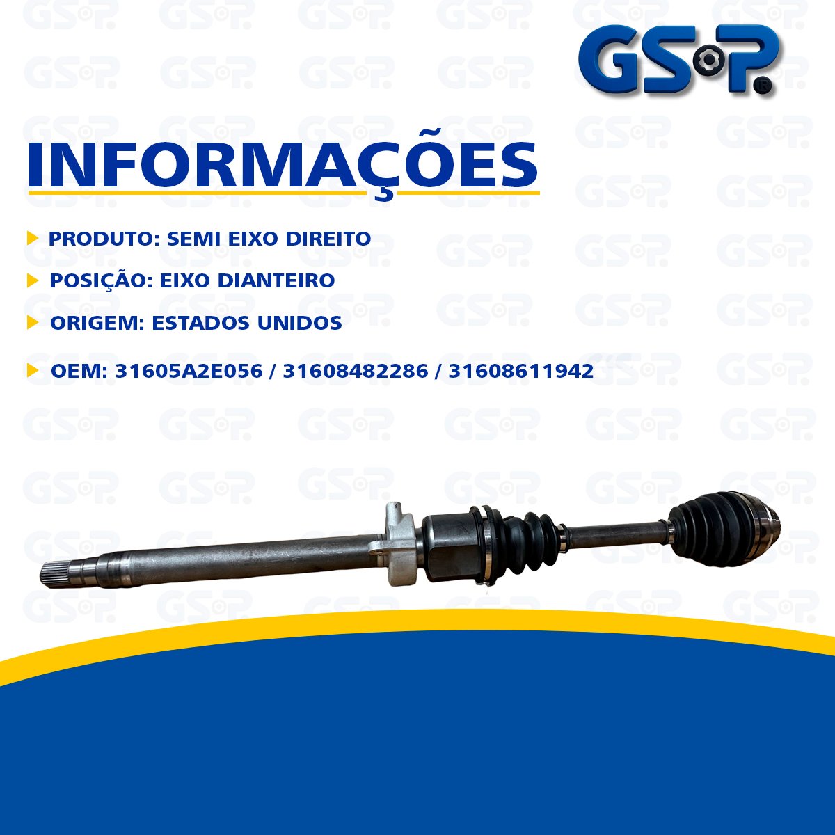 Descrição Semi Eixo Direito Marca GSP Origem Estados Unidos OEM 31605A2E056 / 31608482286 / 31608611942 OBS 31 DENTES EXTERNO / 28 DENTES INTERNO / 904MM