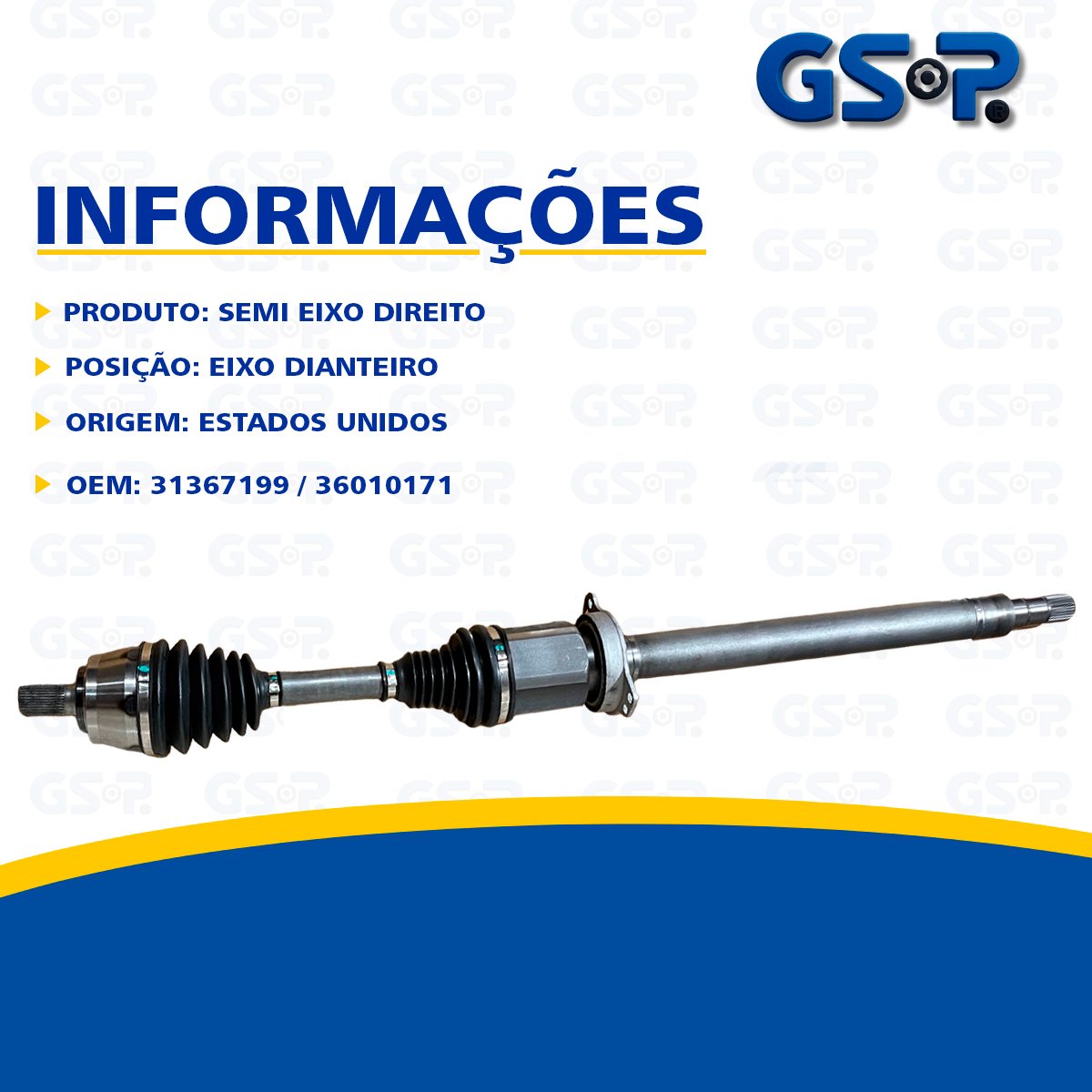 Descrição Semi Eixo Direito Marca GSP Origem Estados Unidos OEM 31367199 / 36010171 OBS 36 DENTES EXTERNO / 26 DENTES INTERNO / 935MM
