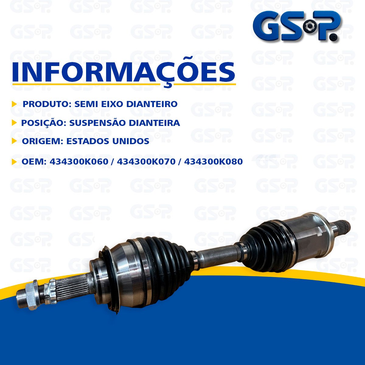 Descrição A GSP é uma das principais fabricantes de peças automotivas para o mercado de reposição mundial. Desde 1985, a empresa se destaca na produção de juntas de velocidade constante, eixos de acionamento, conjuntos de cubos, peças de borracha para metal, além de componentes de direção e suspensão. Com mais de 35 anos de experiência no setor automotivo, a GSP possui centros de distribuição estrategicamente localizados na América do Norte e na Alemanha, garantindo qualidade e eficiência no atendimento ao mercado global. Escolha GSP e surpreenda-se com a qualidade! Marca GSP Origem Estados Unidos OEM 434300K060 / 434300K070 / 434300K080 OBS Medidas 30 X 30 X629