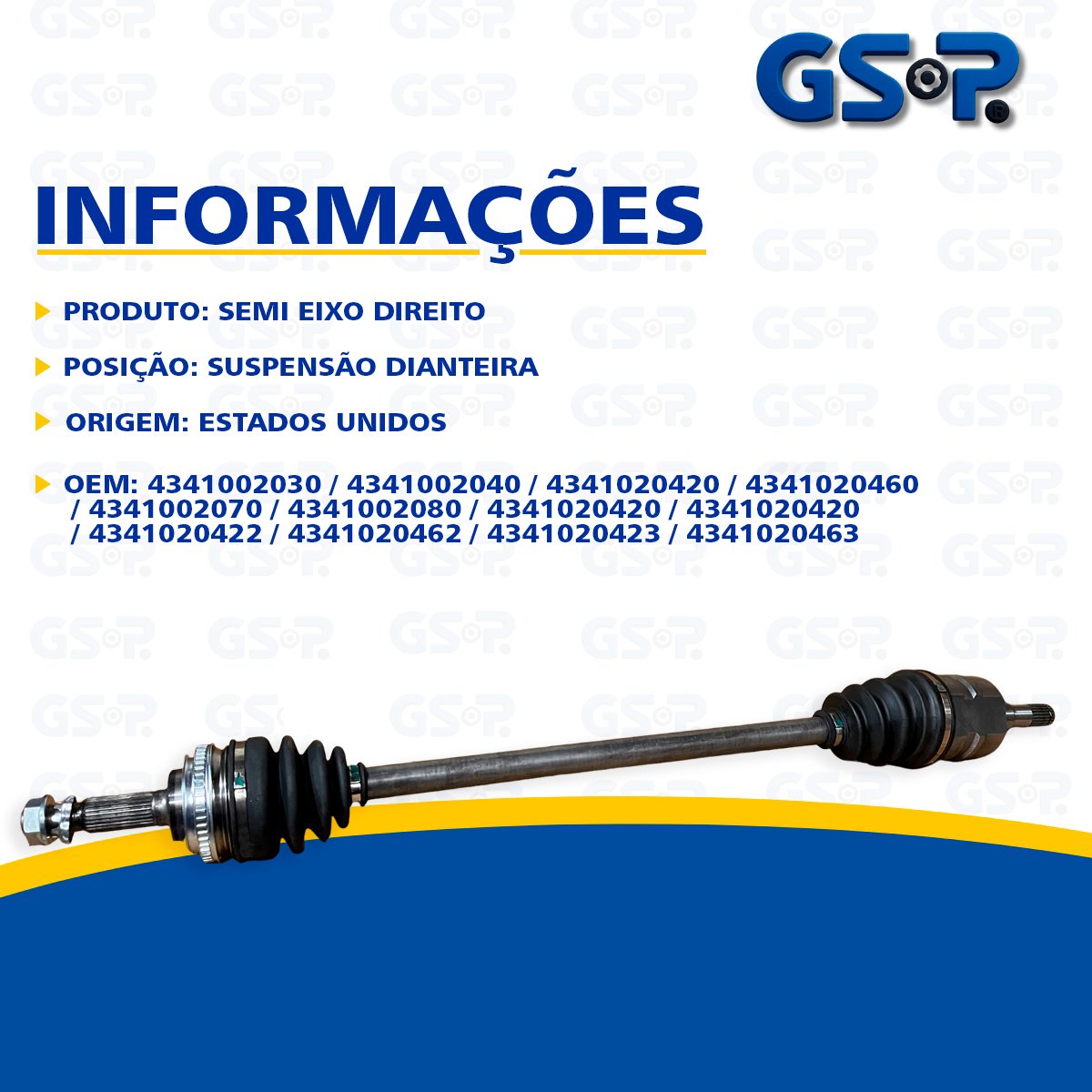 Descrição A GSP é uma das principais fabricantes de peças automotivas para o mercado de reposição mundial. Desde 1985, a empresa se destaca na produção de juntas de velocidade constante, eixos de acionamento, conjuntos de cubos, peças de borracha para metal, além de componentes de direção e suspensão. Com mais de 35 anos de experiência no setor automotivo, a GSP possui centros de distribuição estrategicamente localizados na América do Norte e na Alemanha, garantindo qualidade e eficiência no atendimento ao mercado global. Escolha GSP e surpreenda-se com a qualidade! Marca GSP Origem Estados Unidos OEM 4341002030 / 4341002040 / 4341020420 / 4341020460 / 4341002070 / 4341002080 / 4341020420 / 4341020420 / 4341020422 / 4341020462 / 4341020423 / 4341020463 OBS 26 DENTES EXTERNOS / 23 DENTES INTERNOS / 924MM