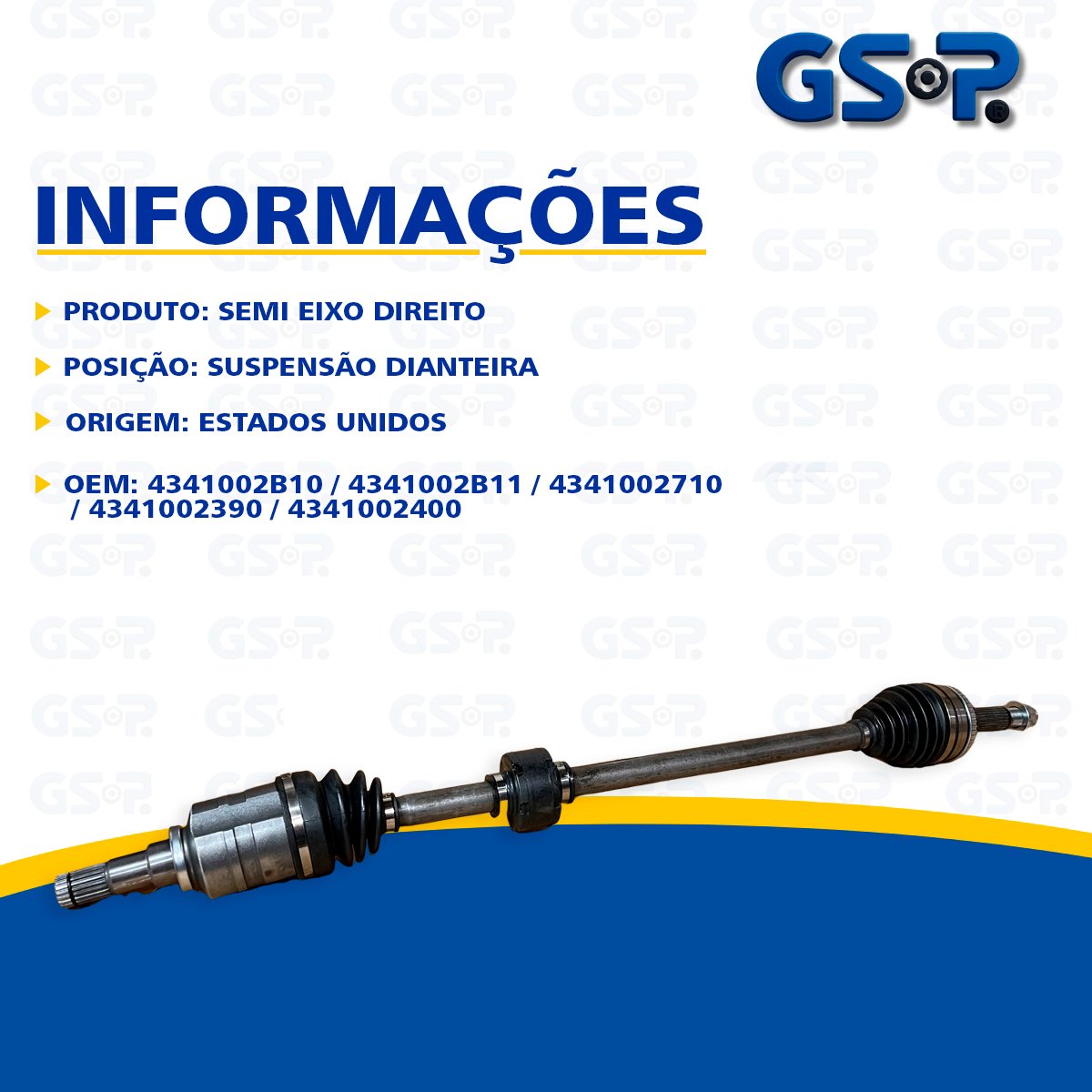 Descrição A GSP é uma das principais fabricantes de peças automotivas para o mercado de reposição mundial. Desde 1985, a empresa se destaca na produção de juntas de velocidade constante, eixos de acionamento, conjuntos de cubos, peças de borracha para metal, além de componentes de direção e suspensão. Com mais de 35 anos de experiência no setor automotivo, a GSP possui centros de distribuição estrategicamente localizados na América do Norte e na Alemanha, garantindo qualidade e eficiência no atendimento ao mercado global. Escolha GSP e surpreenda-se com a qualidade! Marca GSP Origem Estados Unidos OEM 4341002B10 / 4341002B11 / 4341002710 / 4341002390 / 4341002400 OBS 26 DENTES EXTERNO / 20 DENTES INTERNO / 926MM
