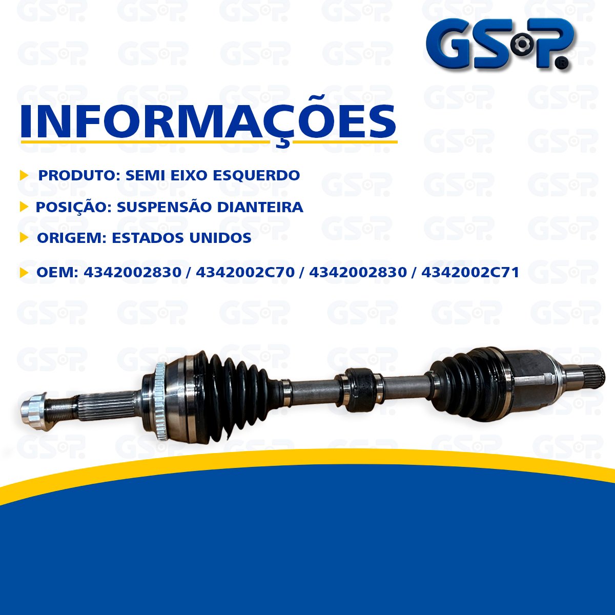 Descrição A GSP é uma das principais fabricantes de peças automotivas para o mercado de reposição mundial. Desde 1985, a empresa se destaca na produção de juntas de velocidade constante, eixos de acionamento, conjuntos de cubos, peças de borracha para metal, além de componentes de direção e suspensão. Com mais de 35 anos de experiência no setor automotivo, a GSP possui centros de distribuição estrategicamente localizados na América do Norte e na Alemanha, garantindo qualidade e eficiência no atendimento ao mercado global. Escolha GSP e surpreenda-se com a qualidade! Marca GSP Origem Estados Unidos OEM 4342002830 / 4342002C70 / 4342002830 / 4342002C71 OBS 26 DENTES EXTERNOS / 24 DENTES INTERNOS / 630MM