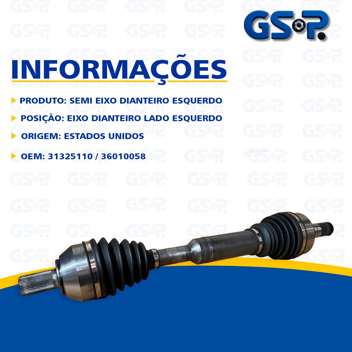 Descrição A GSP é uma das principais fabricantes de peças automotivas para o mercado de reposição mundial. Desde 1985, a empresa se destaca na produção de juntas de velocidade constante, eixos de acionamento, conjuntos de cubos, peças de borracha para metal, além de componentes de direção e suspensão. Com mais de 35 anos de experiência no setor automotivo, a GSP possui centros de distribuição estrategicamente localizados na América do Norte e na Alemanha, garantindo qualidade e eficiência no atendimento ao mercado global. Escolha GSP e surpreenda-se com a qualidade! Marca GSP Origem Estados Unidos OEM 31325110 / 36010058 OBS 40 DENTES EXTERNO / 31 DENTES INTERNO / 596MM