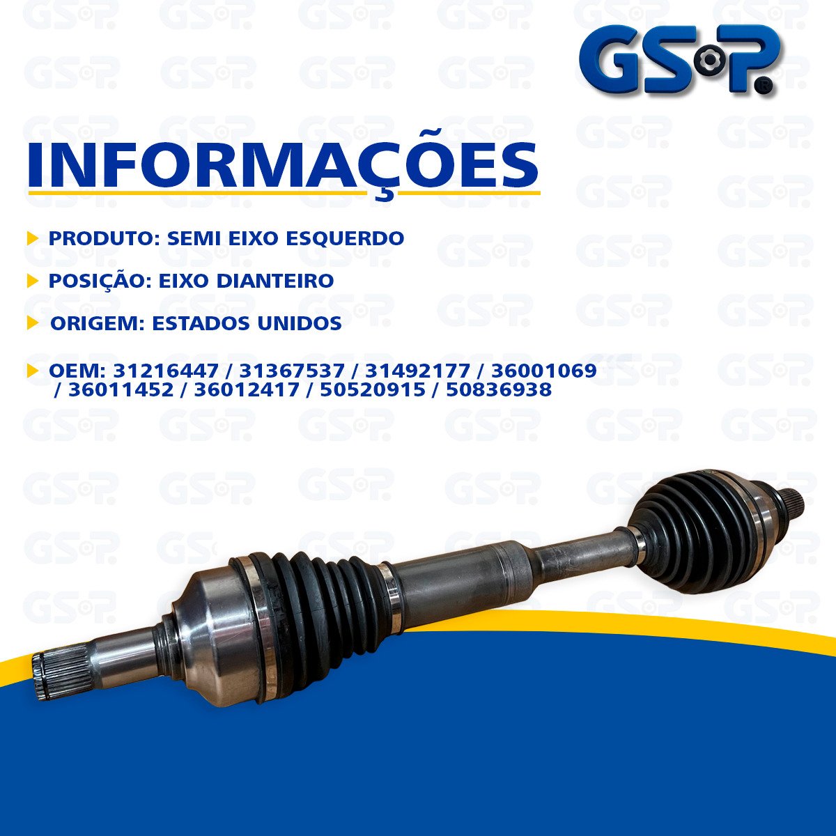Descrição A GSP é uma das principais fabricantes de peças automotivas para o mercado de reposição mundial. Desde 1985, a empresa se destaca na produção de juntas de velocidade constante, eixos de acionamento, conjuntos de cubos, peças de borracha para metal, além de componentes de direção e suspensão. Com mais de 35 anos de experiência no setor automotivo, a GSP possui centros de distribuição estrategicamente localizados na América do Norte e na Alemanha, garantindo qualidade e eficiência no atendimento ao mercado global. Escolha GSP e surpreenda-se com a qualidade! Marca GSP Origem Estados Unidos OEM 31216447 / 31367537 / 31492177 / 36001069 / 36011452 / 36012417 / 50520915 / 50836938 OBS 40 DENTES EXTERNOS / 31 DENTES INTERNOS / 624MM