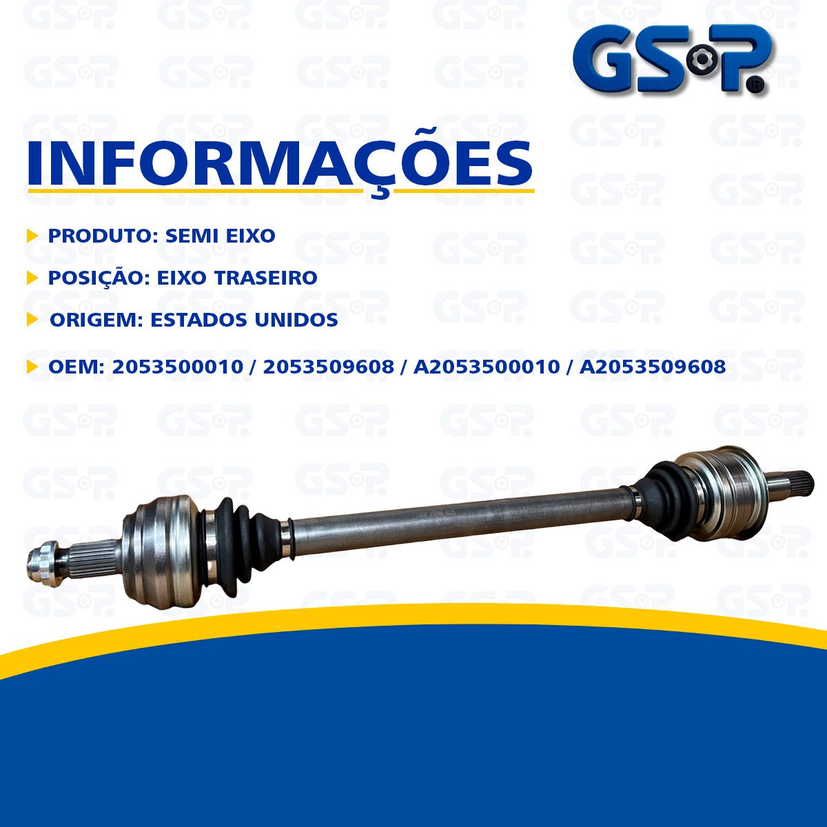 Descrição A GSP é uma das principais fabricantes de peças automotivas para o mercado de reposição mundial. Desde 1985, a empresa se destaca na produção de juntas de velocidade constante, eixos de acionamento, conjuntos de cubos, peças de borracha para metal, além de componentes de direção e suspensão. Com mais de 35 anos de experiência no setor automotivo, a GSP possui centros de distribuição estrategicamente localizados na América do Norte e na Alemanha, garantindo qualidade e eficiência no atendimento ao mercado global. Escolha GSP e surpreenda-se com a qualidade! Marca GSP Origem Estados Unidos OEM 2053500010 / 2053509608 / A2053500010 / A2053509608