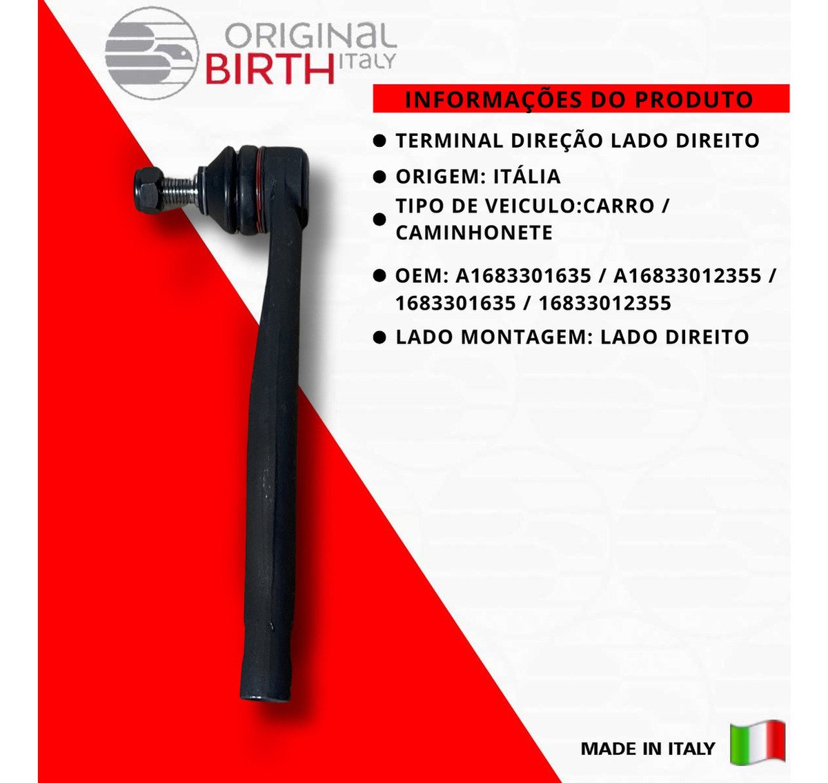 Descrição TERMINAL DIRECAO LADO DIREITO Marca Birth Origem Italia Detalhes do produto ORIGINAL BIRTH são peças de altíssima qualidade fabricada na Itália desde 1979, a ORIGINAL BIRTH é um líder de referência para o mercado com uma qualidade ampla de componentes para todos os modelos de automóveis em circulação. Nível extremo de confiabilidade, são 7,5 milhões de artigos vendidos todos os anos e com presença mundial em 65 países, nos 5 continentes! Somos distribuidor oficial do Brasil da Marca ORIGINAL BIRTH, Todas as peças são novas na caixa e com garantia. Escolha ORIGINAL BIRTH a qualidade vai te surpreender! Informações Complementares INFORMAÇÕES COMPLEMENTARES: B Rosca interna: 1 M 12x1,5 mm Rosca externa: 2 M 12x1,5 mm Lado de montagem: Eixo dianteiro, direito Cilindrada: 15 mm Material: Aço Código do produto: RS0236 OEM A1683301635 / A16833012355 / 1683301635 / 16833012355