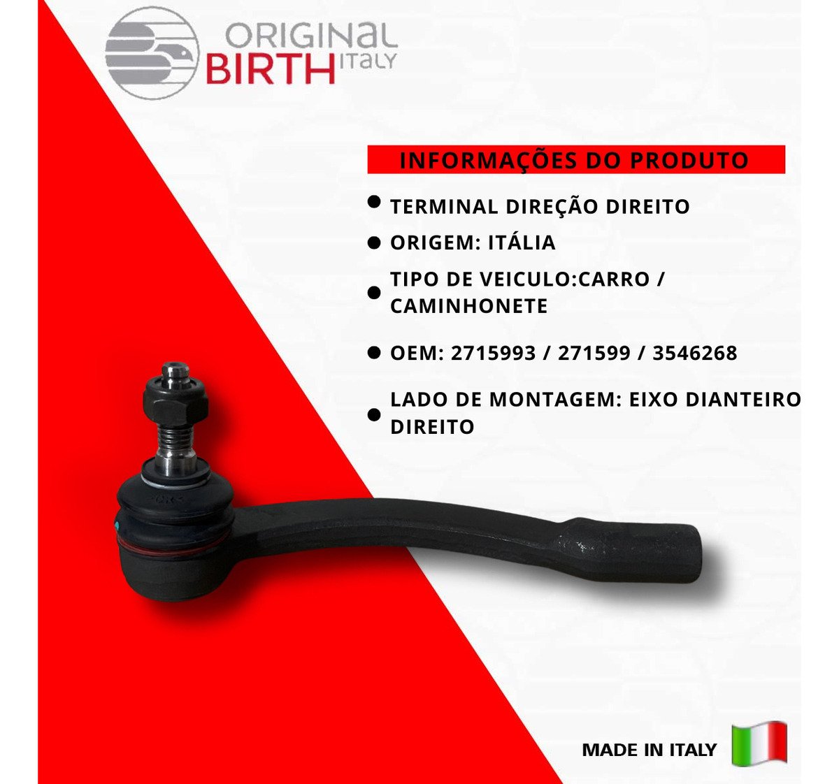 Descrição TERMINAL DIREÇÃO DIREITO Marca Birth Origem Italia Detalhes do produto ORIGINAL BIRTH são peças de altíssima qualidade fabricada na Itália desde 1979, a ORIGINAL BIRTH é um líder de referência para o mercado com uma qualidade ampla de componentes para todos os modelos de automóveis em circulação. Nível extremo de confiabilidade, são 7,5 milhões de artigos vendidos todos os anos e com presença mundial em 65 países, nos 5 continentes! Somos distribuidor oficial do Brasil da Marca ORIGINAL BIRTH, Todas as peças são novas na caixa e com garantia. Escolha ORIGINAL BIRTH a qualidade vai te surpreender! Informações Complementares INFORMAÇÕES COMPLEMENTARES: Rosca interna: 1 M 14x2 mm Rosca externa: 2 M 12x1,75 mm Lado de montagem: Eixo dianteiro, direito Cilindrada: 13 mm Material: Aço OEM 2715993 / 271599 / 3546268